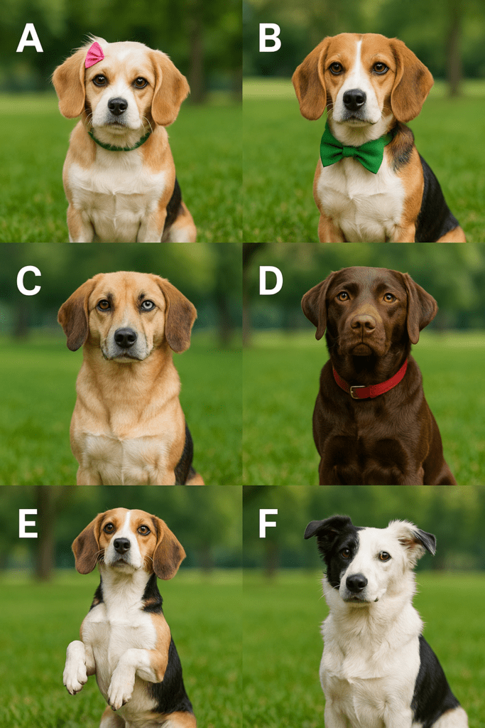 6) Owner 6: “Pongo is always the smartest dog in the park. He doesn’t think he is a dog. He thinks he is a professor. Sometimes he helps me with my word puzzles. He is very handsome, with long brown ears and a brown-and-white face. Usually, he wears a red bow tie, but today he wanted to wear a green bow tie.” Dog ___