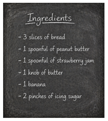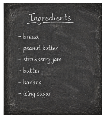 The teacher asks how many of the ingredients on the list are countable. There is only one: a banana. The teacher now asks the students how many bananas they will need for the sandwich recipe.