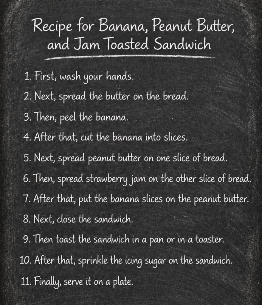 Next, the teacher writes the word ‘Ingredients’ on the board and asks the students to call out the ingredients they think should be included in the sandwich recipe.